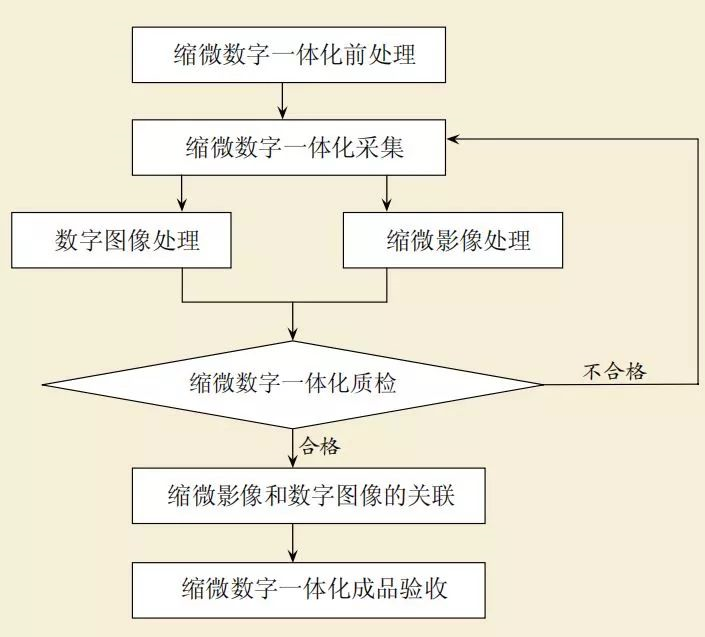 纸质档案缩微数字一体化加工基本环节包括:缩微数字一体化前处理、缩微数字一体化采集、数字图像处理和缩微影像处理、缩微影像和数字图像的关联、缩微数字一体化成品验收(如图1所示)。