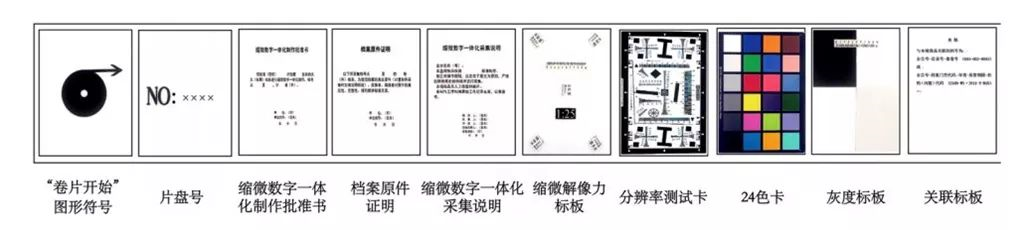 前标识区标板包括:“卷片开始”图形符号、片盘号、缩微数字一体化制作批准书、档案原件证明、缩微数字一体化采集说明、缩微解像力标板、分辨率测试卡、24色卡、灰度标板、关联标板(如图2所示)。