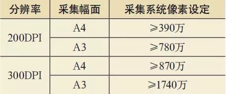 当A4幅面清晰度要求达到200DPI时,采集系统像素设定应不小于390万像素,达到300DPI时,采集系统像素设定应不小于870万像素;A3幅面清晰度要求达到200DPI时,采集系统像素设定应不小于780万像素,达到300DPI时,采集系统像素设定应不小于1740万像素。