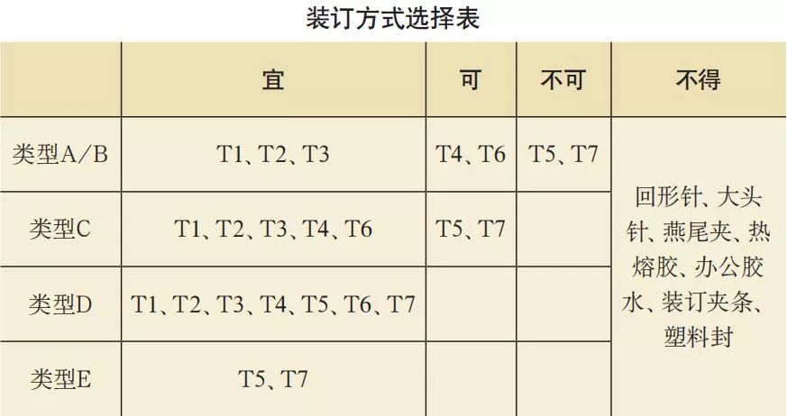 在装订方式选择上,《规范》分为“宜、可、不可、不得”4档,规定了不同装订需求下对应的装订方式。“宜”是《规范》建议、推荐的方式,“可”是该类型可以使用的方式,“不可”是在该类型中不建议采用的方式,“不得”是在任何类型中都不能采用的方式。从有利于长期保存、装订牢固度、空间占用、管理成本、操作难易程度、适合范围等方面综合考虑,《规范》提出了不同装订需求类型对应的装订方式(见下表)。