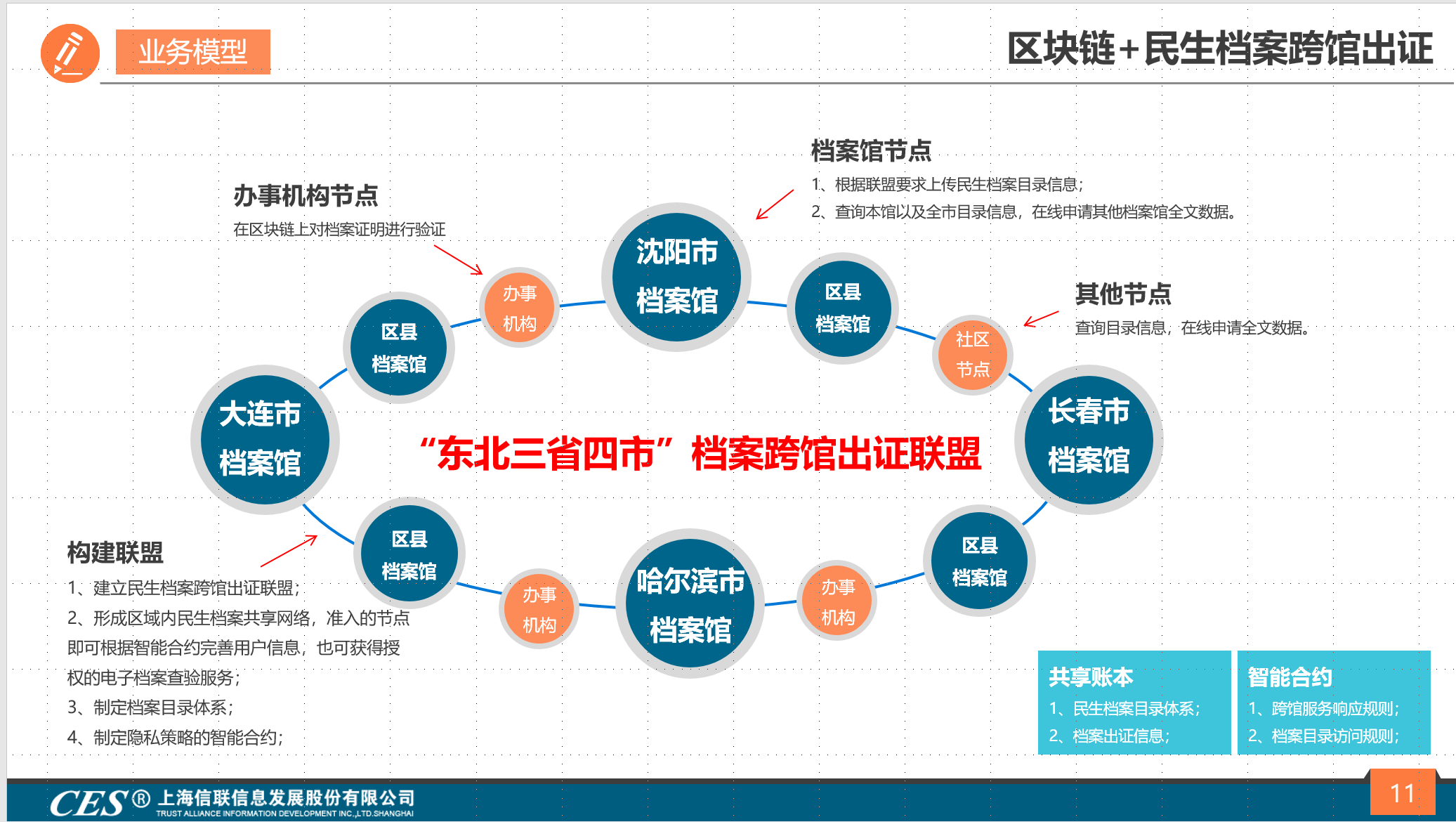 为解决民生档案的查询需求,沈阳市档案馆提出建设覆盖市、区(县)两级档案馆的民生档案跨馆利用平台,该平台在《基于区块链技术的民生档案跨馆服务平台研究与实践》课题的研究成果上,创新的引入区块链技术作为支持,采用基于Hyperledger Fabric的联盟链技术,开发建设市、区两级档案馆共同接入的基于区块链技术的民生档案跨馆利用平台,通过区块链的共识机制和智能合约,鼓励各档案馆积极提供民生档案共享服务资源,实现高效的民生档案跨馆检索、授权和使用服务,最终建成沈阳市“民生档案共享联盟”。