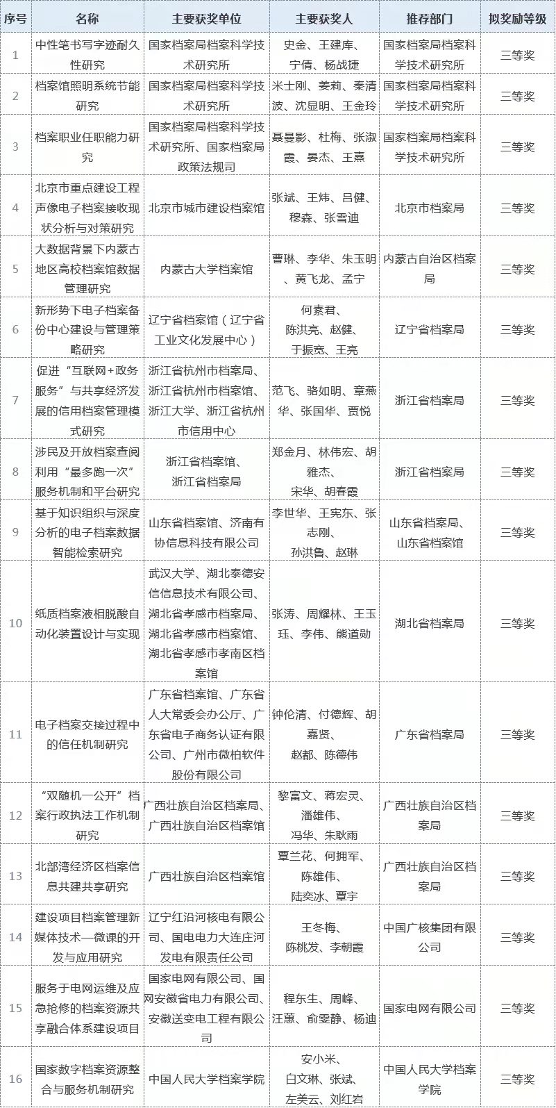 根据《国家档案局办公室关于开展2021年度国家档案局优秀科技成果奖励工作的通知》要求和《国家档案局优秀科技成果奖励办法》规定,国家档案局组织了2021年度优秀科技成果奖励评审工作,经形式审查、专家评审等环节,按照公平、公正、公开的原则,确定了26项拟奖励优秀科技成果。现予以公示,公示期为2021年10月14日至2021年11月12日。