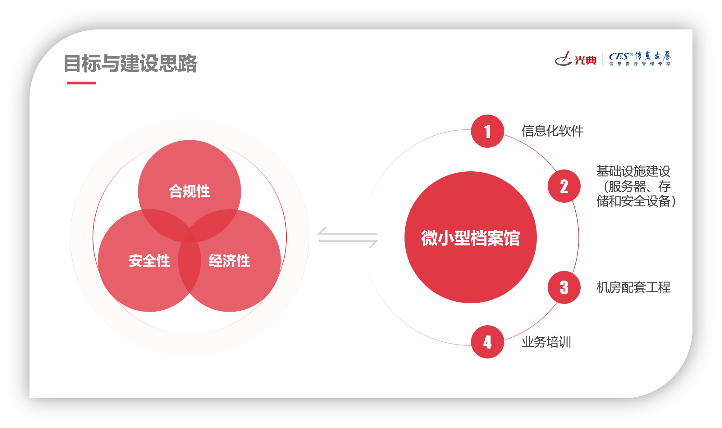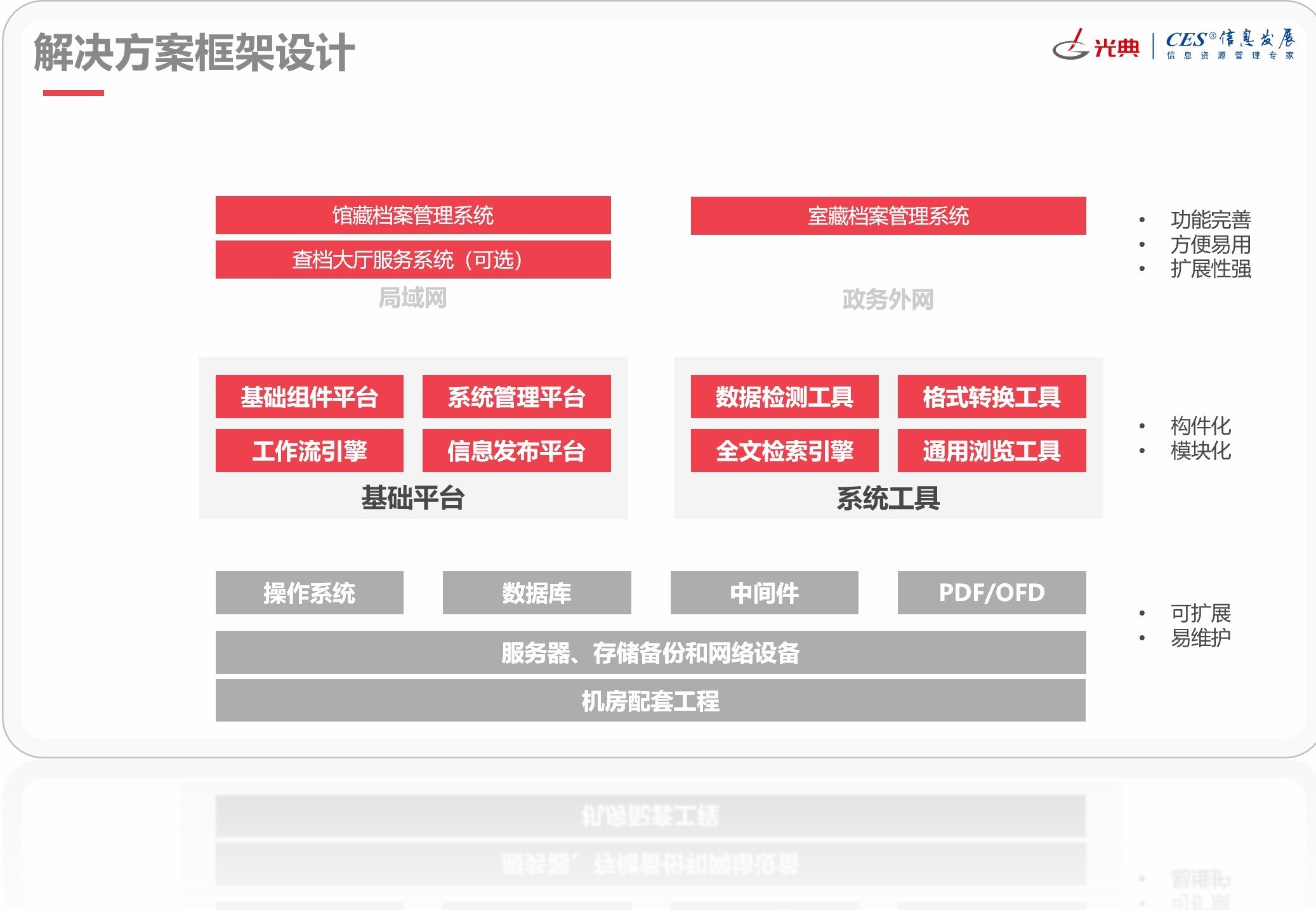 紧跟政策要求,聚焦业务需求,光典信息发展有限公司在数字档案馆建设和智慧档案馆建设方面,具备扎实的理论体系、先进的技术手段与丰富的行业经验。公司始终致力于提升档案服务效能,顺应国情发展需要,针对基层档案管理现存的痛点,推出了乡镇(街道)微小型数字档案馆解决方案。该方案围绕乡镇档案管理的合规性、安全性、经济性目标展开,从信息化软件建设、基础设备建设(服务器、存储和安全设备)、机房配备工程建设等方面切入,分阶段推动乡镇(街道)微小型数字档案馆的建设。