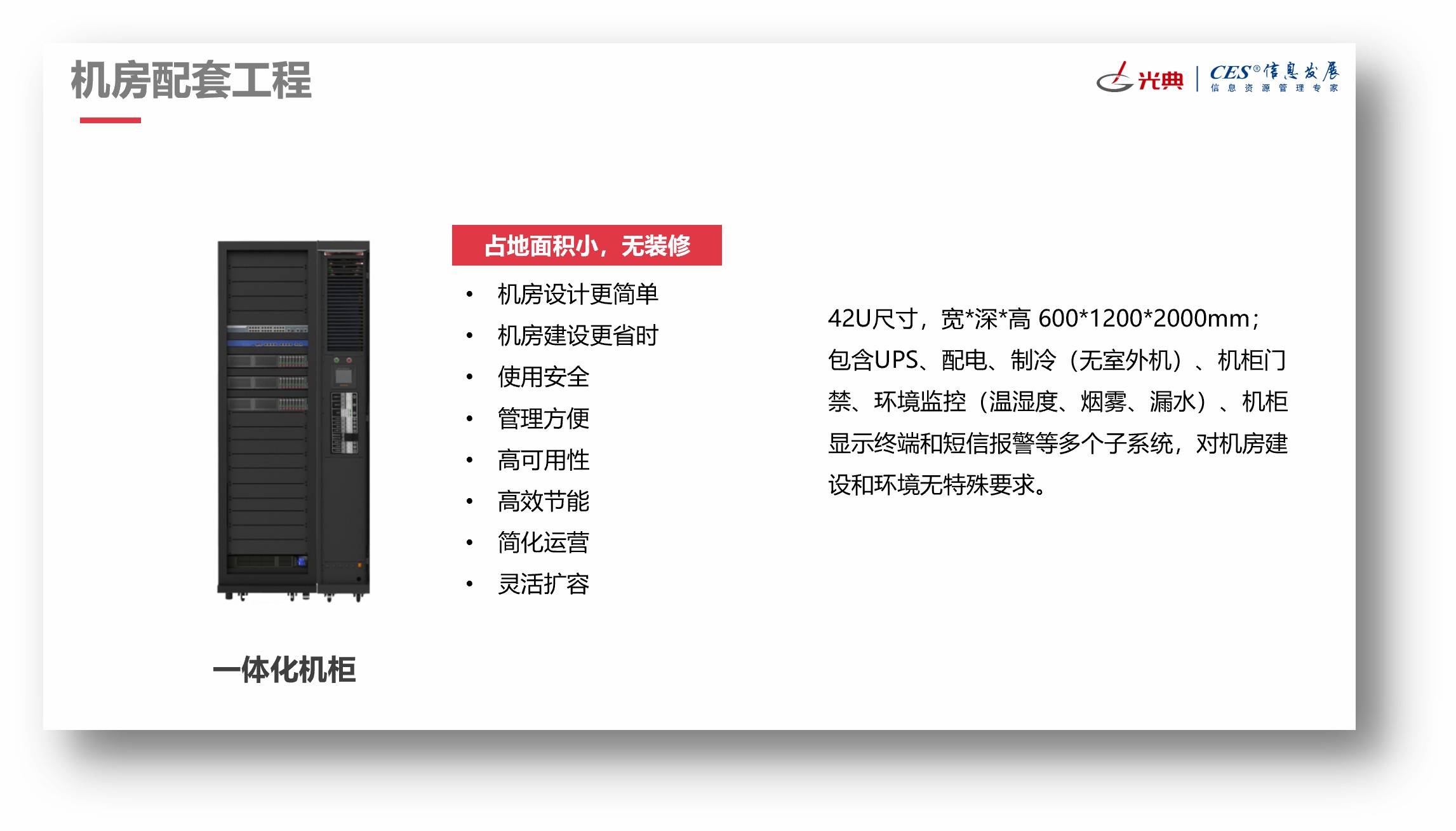 在基础设施建设方面,适用于乡镇(街道)档案馆的一体化机柜,集成了UPS、配电、制冷、机柜门禁、环境监控(温湿度、烟雾、漏水检测等)、机柜显示终端和短信报警等多个子系统,使用安全、管理方便。一体化机柜,具有高可用性、高效节能、简化运营、灵活扩容、占地面积小和无装修的特点,让微小型数字档案馆的机房设计更简单省时、机房建设更便捷高效。
