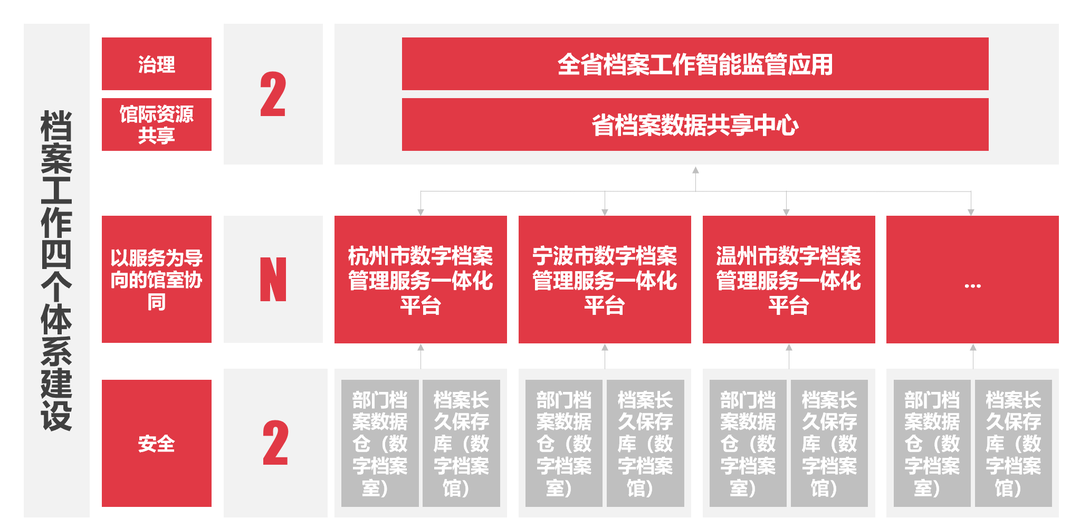 “N”:坚持分级属地管理与一体集成应用相结合,协同建设若干个市域、县域数字档案管理服务一体化平台。