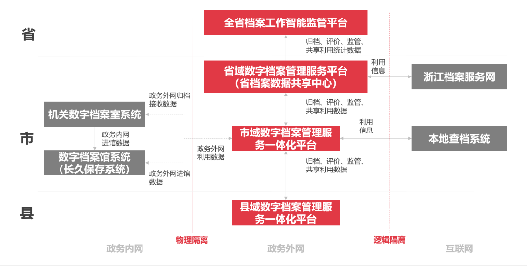 基于政务外网统一建设,面向区域内各级组织,打造具备数字档案收集、管理、利用和监督指导等功能的市域、县域数字档案管理服务一体化平台,实现本区域内各类档案应用的综合集成。