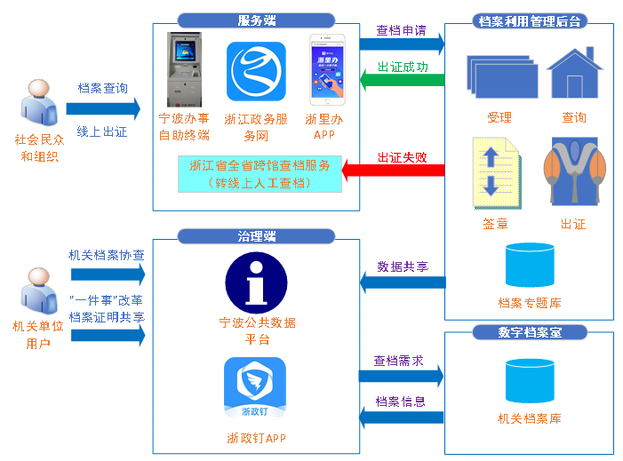 为积极响应浙江省数字化改革要求,宁波市镇海区全面深化改革委员会印发了《镇海区数字化改革总体行动方案》,方案对数字档案应用场景提出明确要求:迭代升级档案数据整合和系统,对接市电子文件“预归档系统”,面向政府部门统筹推进政务服务和公共数据等领域电子文件归档和电子档案管理应用;对接国家共享平台建设,深化长三角区域民生档案“一网查档”,建设档案数据多场景应用,面向民众实施档案管理和开放共享示范工程,实现掌上查档和电子出证等应用;推广应用“浙里办”APP掌上查档服务平台和“浙政钉”机关查档直通车,扩大“一网查档、异地出证”惠民服务覆盖面。